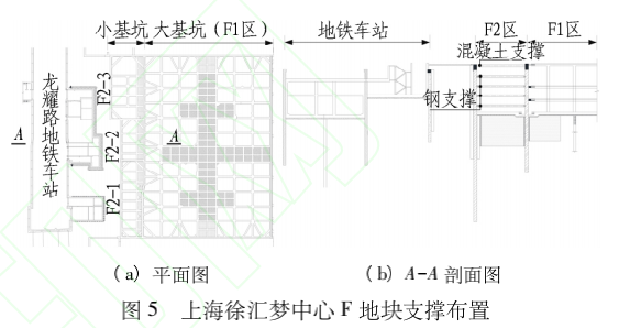 上海黄浦江南延伸地块项目包含9个地块,整体设置3层地下室,项目西侧为地铁11号线龙耀路车站及区间隧道。其中,梦中心F地块位于西侧中间位置,基坑总面积约1万m2。为降低基坑开挖对邻近西侧地铁设施的影响,将基坑分为F1、F2-1、F2-2、F2-3、4个区域,先实施远离地铁的F1区大基坑,待地下结构完成后,再依次开挖F2-1、F2-2及F2-3区,如图5所示。邻近地铁窄条基坑F2区竖向设置5道支撑,第1道为混凝土支撑,第2—5道均为轴力自动补偿钢管支撑,如图6所示,开挖过程中通过液压系统进行轴力控制,预加轴力分别为1 200、1 500、1 800、2 000 kN。